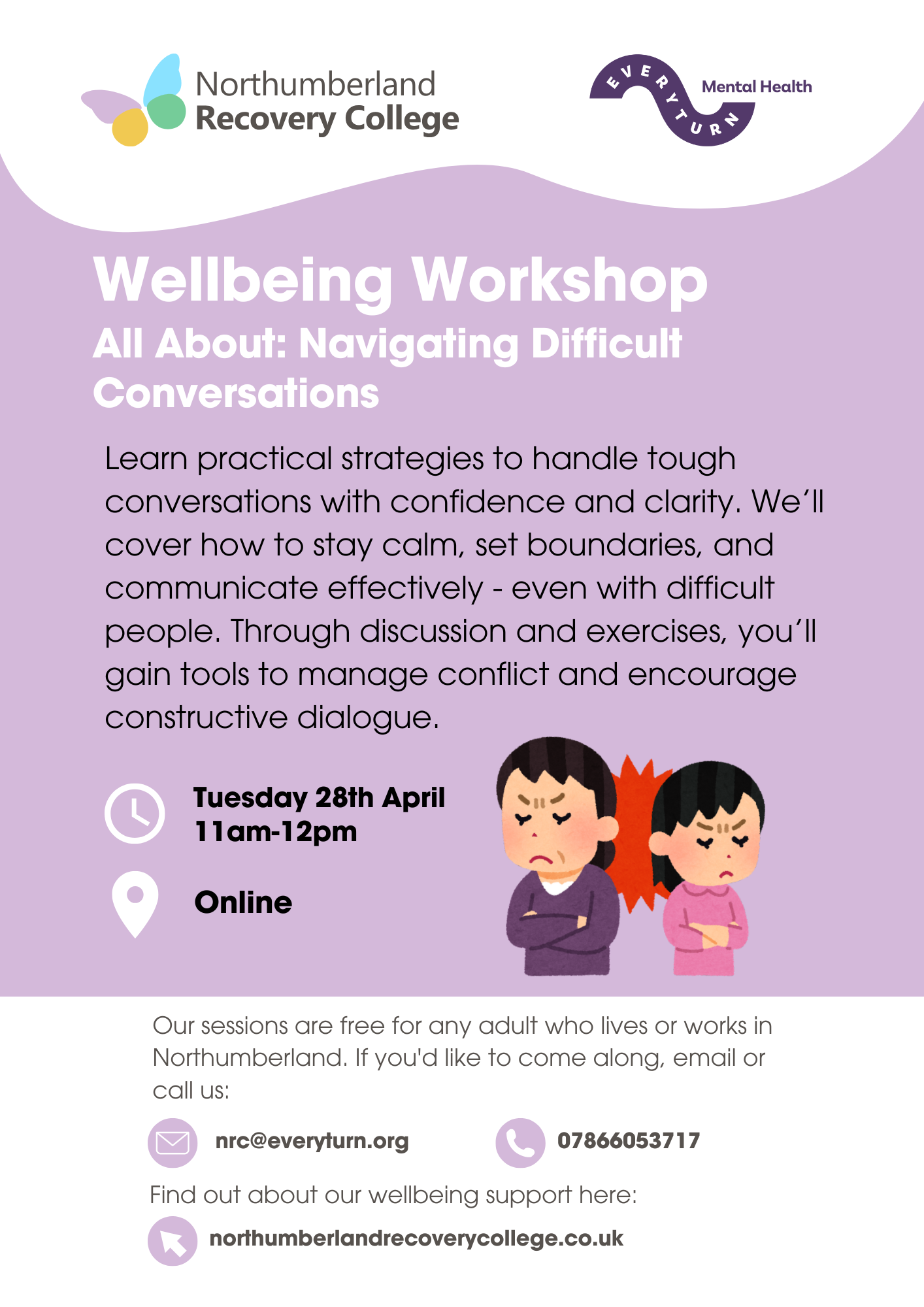 This session is free and open to anyone aged 18+ who lives or works in Northumberland. Please fill out our Enrolment Form and email nrc@everyturn.org to book your space and receive the joining link.