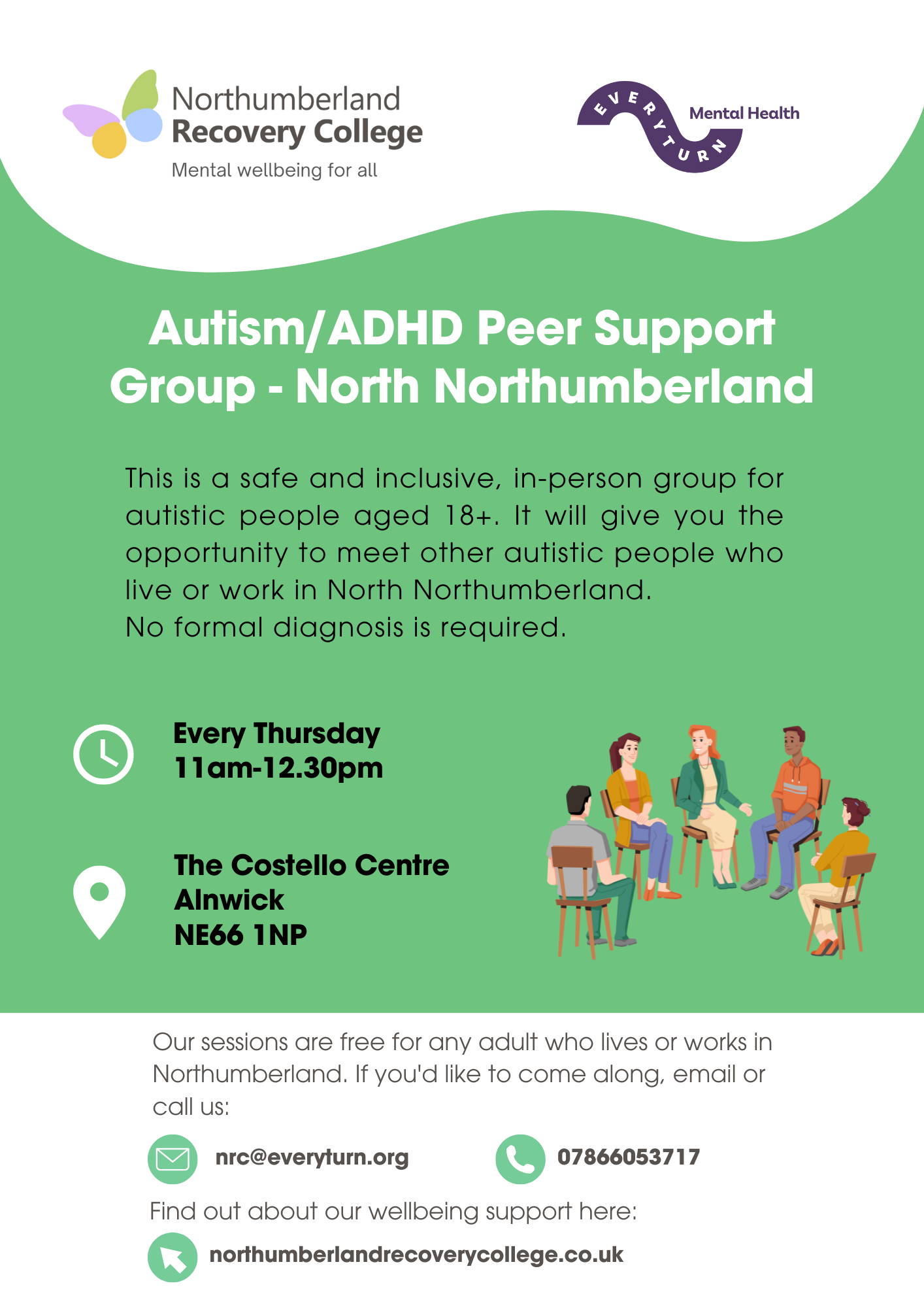 This is a safe and inclusive, in-person group for autistic people aged 18+. It will give you the opportunity to meet other autistic people who live or work in North Northumberland.