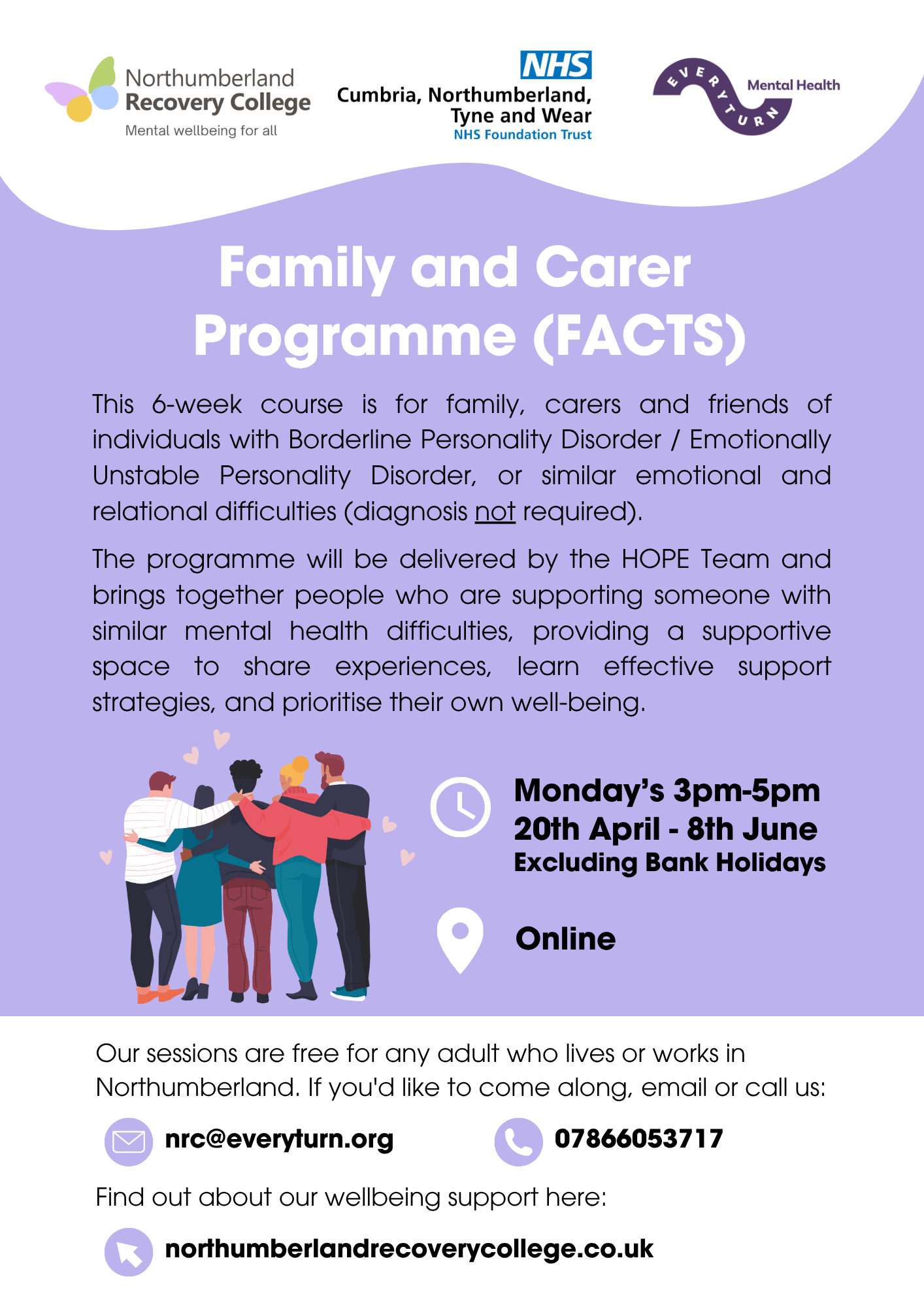 This 6-week course is for family, carers and friends of individuals with Borderline Personality Disorder / Emotionally Unstable Personality Disorder, or similar emotional and relational difficulties (diagnosis not required).