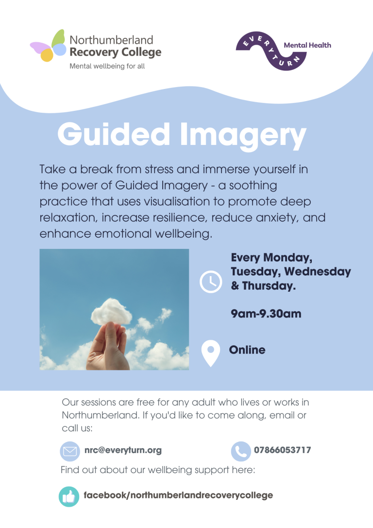 Research has shown that guided imagery can help us to manage stress and anxiety. In these sessions, you will listen to a guided script to help you to focus on your breathing and imagining.