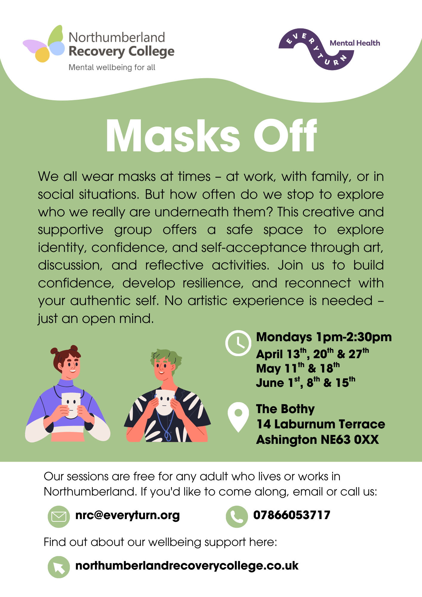 We all wear masks at times – at work, with family, or in social situations. But how often do we stop to explore who we really are underneath them? This creative and supportive 8 week course offers a safe space to explore identity, confidence, and self-acceptance through art, discussion, and reflective activities. Join us to build confidence, develop resilience, and reconnect with your authentic self. No artistic experience is needed – just an open mind.
