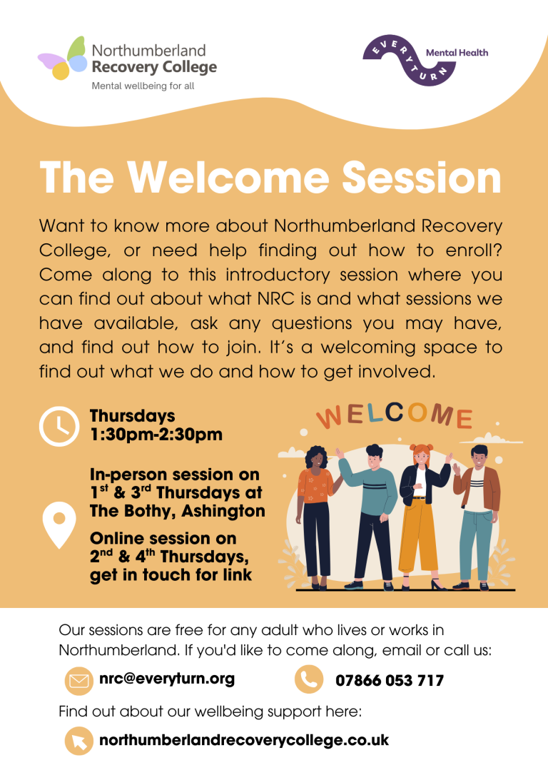 Want to know more about Northumberland Recovery College, or need help finding out how to enroll? Come along to this introductory session where you can find out about what NRC is and what sessions we have available, ask any questions you may have, and find out how to join. It’s a welcoming space to find out what we do and how to get involved.